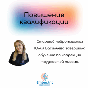 Старший нейропсихолог нашего центра, Юлия Васильева, прошла обучение по программе «Нейропсихологический подход к обучению и коррекции технической стороны письма».